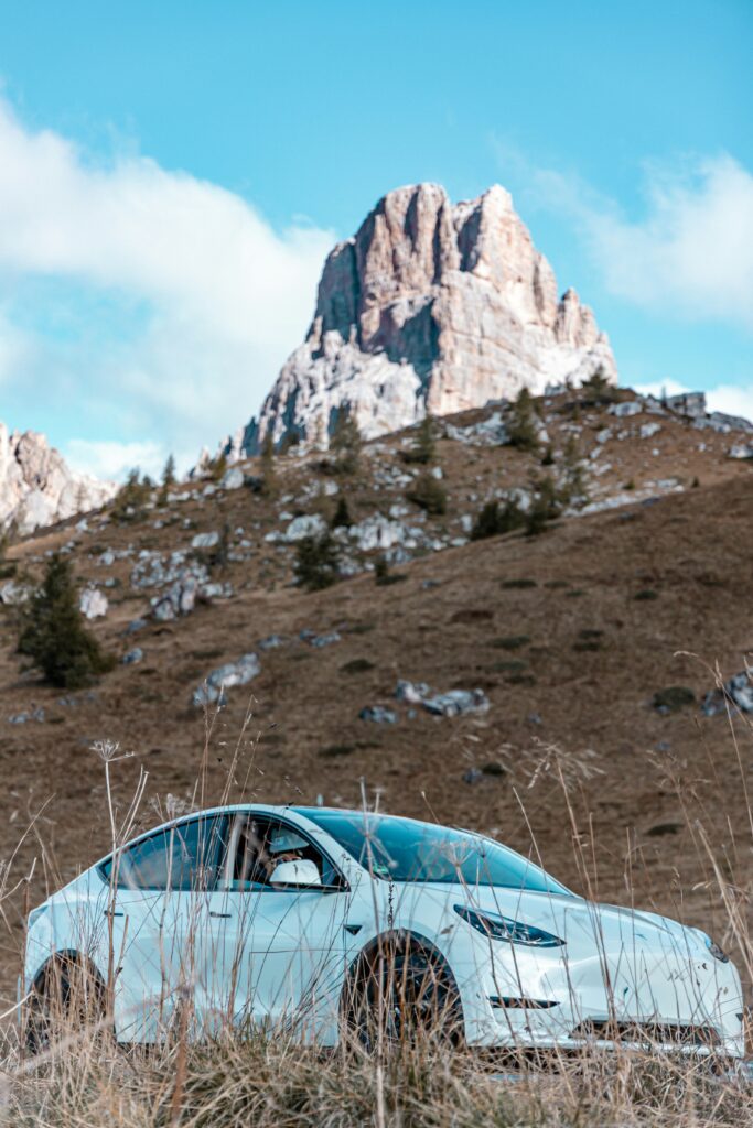 Tesla Model 3 i solnedgang på en bakketop